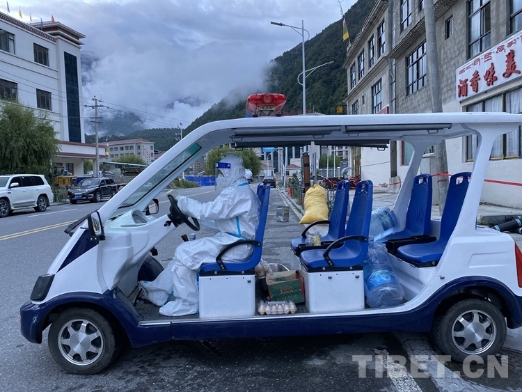 圖為西藏吉隆出入境邊防檢查站移民管理警察向隔離群眾運(yùn)送生活物資 攝影:肖富貴