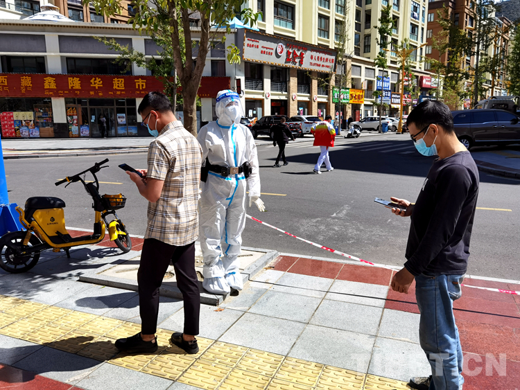 林芝邊境管理支隊機(jī)關(guān)民警曹婷正在核酸檢測點維護(hù)現(xiàn)場秩序 攝影:張航