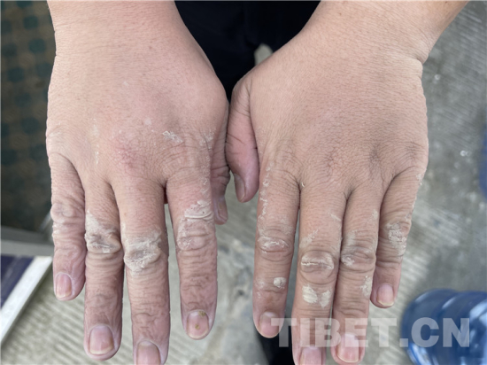 摘下戴了十幾個小時的手套,每根手指都被捂皺變形,關(guān)節(jié)處的皮膚泛白腫脹——看到日喀則邊境管理支隊吉隆邊境派出所民警桂浩的手部照片,讓人不禁淚目。