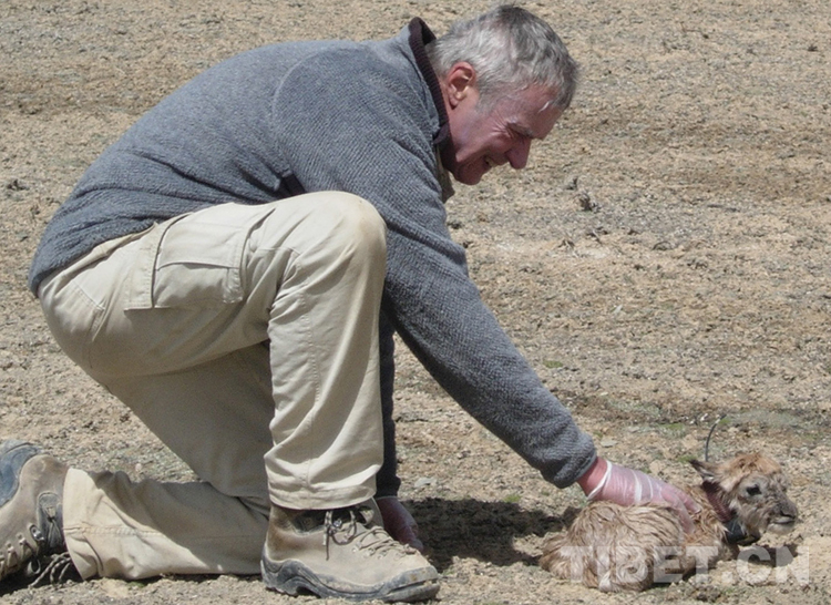 這是夏勒博士在觀察剛出生不久的藏羚羊羊羔(蔡新斌2005年6月26日攝)