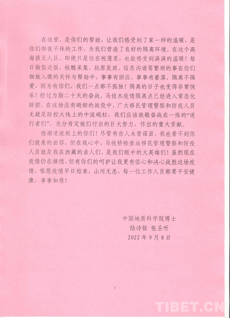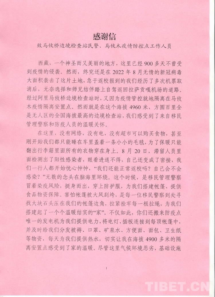 一次次走訪,一件件回應……這一系列真實、暖心的舉動,讓馬攸橋邊境檢查站的民警與滯留群眾建立了深厚情誼,也讓2人滯留結束回到北京后,寫下了這封感謝信。陸詩鳴、張圣聽的真情流露,飽含著群眾對馬攸橋邊境檢查站民警的信任,讓這個海拔4900多米的臨時安置點顯得更加溫暖。(中國西藏網(wǎng) 通訊員/張拴根 唐彪 記者/次旦拉姆 馬攸橋邊境檢查站供圖)