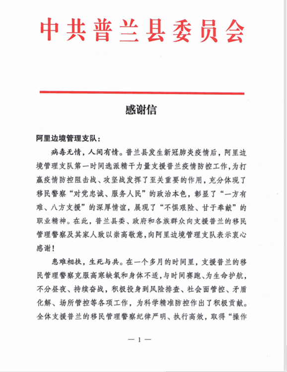 中國西藏網(wǎng)訊 “普蘭縣發(fā)生新冠肺炎疫情后,阿里邊境管理支隊第一時間選派精干力量支援普蘭疫情防控工作,為打贏疫情防控阻擊戰(zhàn)、攻堅戰(zhàn)發(fā)揮了至關(guān)重要的作用?!?0月2日,西藏自治區(qū)阿里邊境管理支隊收到一封來自阿里地區(qū)普蘭縣委的感謝信。信中對阿里邊境管理支隊戰(zhàn)“疫”一線民警在一個多月的疫情防控工作中,克服困難、勇于擔當、不分晝夜、持續(xù)奮戰(zhàn)的抗疫工作表達了感謝,給予了肯定。