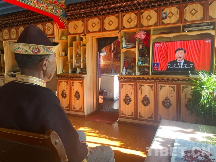 圖為西藏自治區(qū)林芝市巴宜區(qū)布久鄉(xiāng)老黨員在家觀看黨的二十大開幕會 圖片由林芝市委宣傳部提供