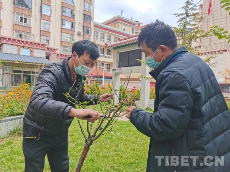 土登丁增(右)教授物業(yè)工作人員修剪樹(shù)枝