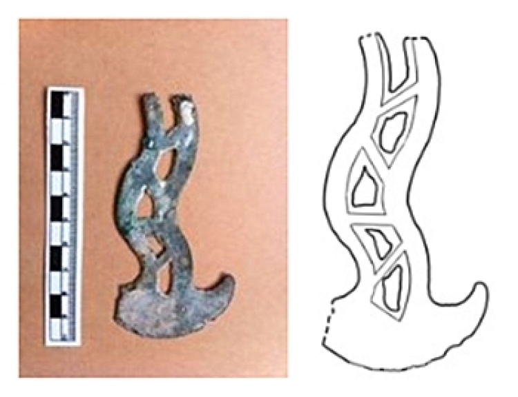 結(jié)合已有考古研究成果,余小洪分析稱(chēng),“高原絲綢之路”上的銅鉞形器,刃部受到云南不對(duì)稱(chēng)形銅鉞的影響,不規(guī)則形鏤孔裝飾則受到青海省治多縣普卡貢瑪石棺墓牌飾的影響,是一種融合型新器物。