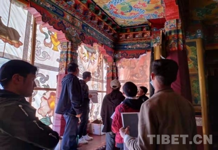 圖為2021年,西藏民族大學(xué)實(shí)習(xí)生參與檢查杰拉康寺木構(gòu)建筑的破損程度,并對設(shè)計方案提出意見