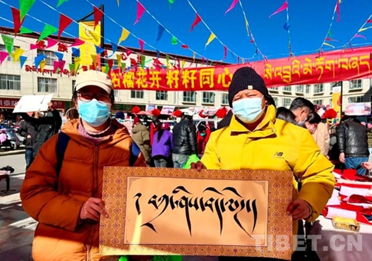 圖為活動(dòng)現(xiàn)場市民拿著書法家書寫的藏文春聯(lián)跟書法家合影留念