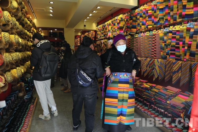在去八廓街的路上,街邊的一家藏裝店吸引了記者的目光,店內(nèi)的藏裝款式多樣,邦典色彩艷麗、種類繁多,一排排的次仁金果(藏式帽子)做工精細(xì)、款式新穎,在陽光的照耀下金光閃閃,十幾平米的小店顧客盈門。