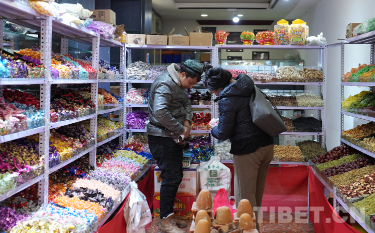 在八廓商城附近的一家門店里,來自新疆當(dāng)?shù)氐暮吞锎髼?、天山沙棗、葉城核桃、大白杏干、馬奶子葡萄干、天山烏梅、巴旦木等,因食材地道、品質(zhì)優(yōu)良格外受到拉薩市民的青睞。老板是位“00”后維吾爾族青年,頭腦靈活,待人熱情,近日來持續(xù)火爆的生意更是讓他高興得合不攏嘴。上門購物的顧客有藏族、漢族、回族等民族,他們除了購買地道的新疆干果,還會(huì)購買該店專為藏歷新年新上的大白兔奶糖、彩色硬質(zhì)水果糖、果汁軟糖、巧克力、棒棒糖、藏式奶渣等貨品。人們用漢語加手勢比劃著交流,溝通無礙,再加上移動(dòng)支付方便快捷,老板誠信經(jīng)營,顧客們總能高興而來,滿意而歸。