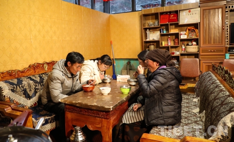 “古突”煮好了,扎西一家人圍坐在桌邊。“妹妹肯定會(huì)吃到辣椒,姐姐可能會(huì)吃到石頭。”阿媽尼瑪拉宗在吃“古突”前和姐妹兩人開(kāi)玩笑,一家人相互打趣,有說(shuō)有笑,其樂(lè)融融。