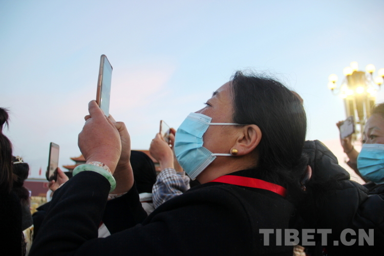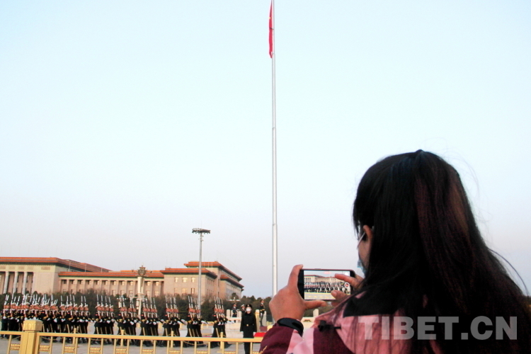 清晨6時許,軍樂團(tuán)在天安門廣場就位?!罢阶?!”隨著一聲響亮的口令,國旗護(hù)衛(wèi)隊邁著鏗鏘的正步,拱衛(wèi)國旗走過天安門城樓、金水橋?!跋驀炀炊Y!”6時9分,隨著響亮的口令,軍樂團(tuán)奏響了國歌《義勇軍進(jìn)行曲》,升旗手高高揚(yáng)起國旗,鮮艷的五星紅旗迎著朝陽冉冉升起?!?023年西藏基層婦聯(lián)干部赴京學(xué)習(xí)參觀團(tuán)”成員們紛紛用手機(jī)記錄下這難忘的時刻。