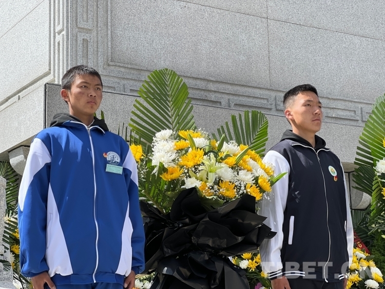 圖為拉薩那曲第一高級(jí)中學(xué)學(xué)生代表向革命先烈敬獻(xiàn)花籃 攝影:德吉卓瑪