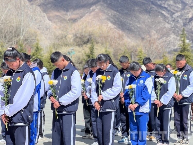 圖為拉薩那曲第一高級(jí)中學(xué)學(xué)生代表集體默哀 攝影:德吉卓瑪