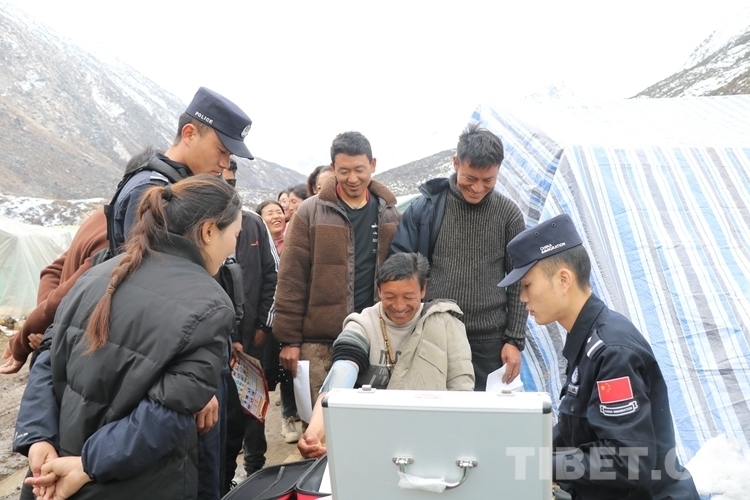 圖為林芝臥龍邊境派出所民警龍俊吉在蟲草采挖區(qū)幫助群眾測量血壓 攝影:沈朋