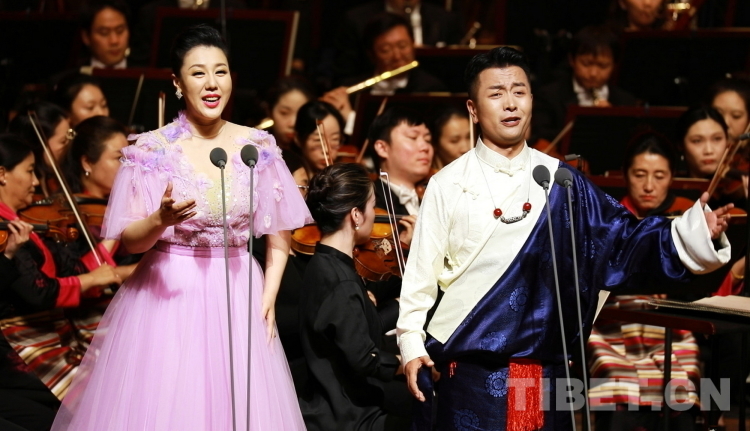 圖為中音歌唱家、國家一級演員霍勇,西藏自治區(qū)歌舞團(tuán)青年女高音次仁央宗領(lǐng)合唱《美麗的西藏 可愛的家鄉(xiāng)》 攝影:劉莉