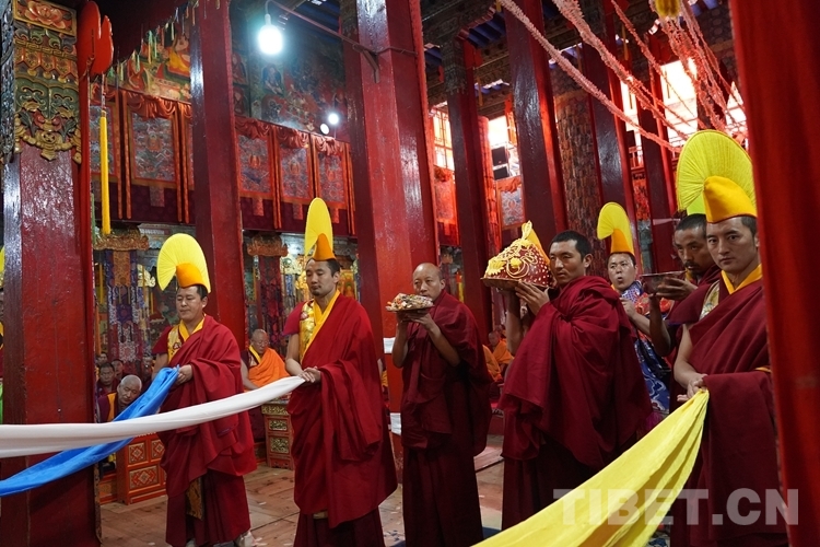 在措欽大殿內(nèi),班禪每到一座佛像前都雙手合十為眾生祈禱,并向佛像敬獻(xiàn)哈達(dá),祈求國(guó)泰民安、利樂(lè)眾生。措欽大殿內(nèi)的眾僧也并排而坐齊聲誦經(jīng)、虔誠(chéng)祝禱。禮佛后,班禪登上措欽大殿寶座,寺廟高僧代表向班禪敬獻(xiàn)曼扎(佛像、經(jīng)書(shū)、佛塔)、誦祈愿永駐贊;班禪向寺廟僧眾傳授賜予《文殊真實(shí)名經(jīng)》,并為僧眾摸頂。