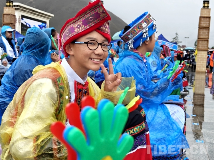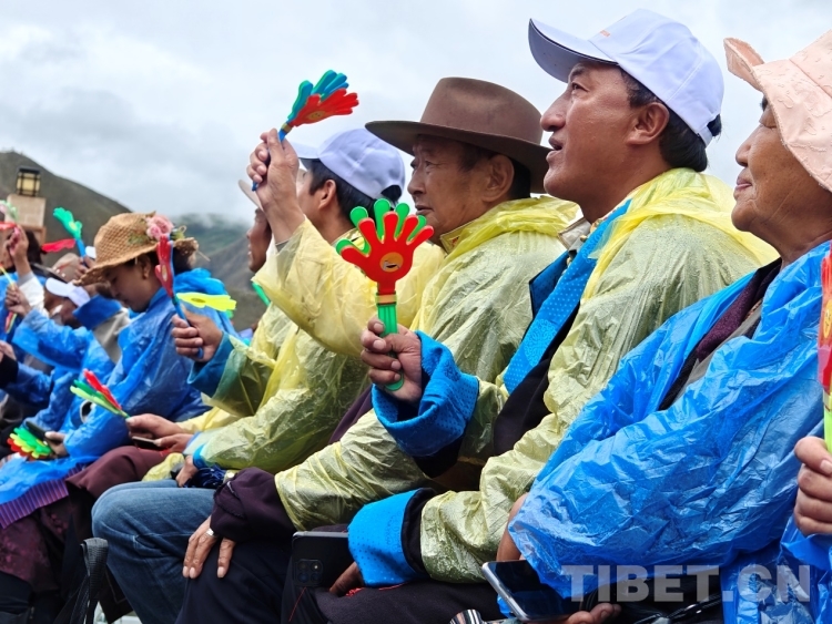 當(dāng)天上午,雨水時(shí)急時(shí)緩下著。當(dāng)?shù)孛癖姄沃鴤?、披著雨衣早早落座等待演出開(kāi)始。白瑪次仁是附近的村民,他告訴記者:“我平時(shí)就喜歡唱歌和跳舞,所以收到有文藝演出的通知就早早過(guò)來(lái)觀看,畢竟平時(shí)很少看到如此大型的演出?!?/span>