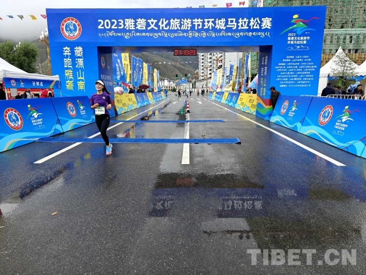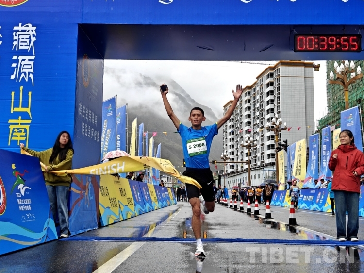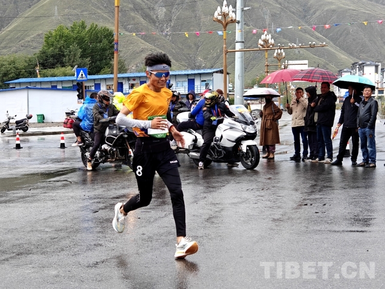 圖為競速跑11公里男子組第一名格桑旺堆抵達(dá)終點(diǎn) 攝影:次旦拉姆