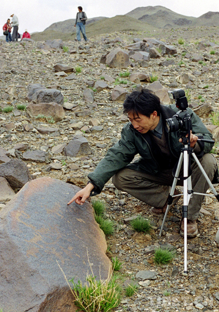 藏北高原無人區(qū)科考團人員在對尼瑪縣榮瑪鄉(xiāng)加林山巖畫進行科考(唐召明2001年攝)