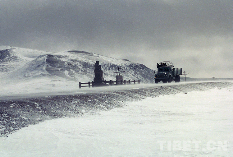 在風雪彌漫的唐古拉山上,一輛汽車正在通過山口(唐召明1991年攝)