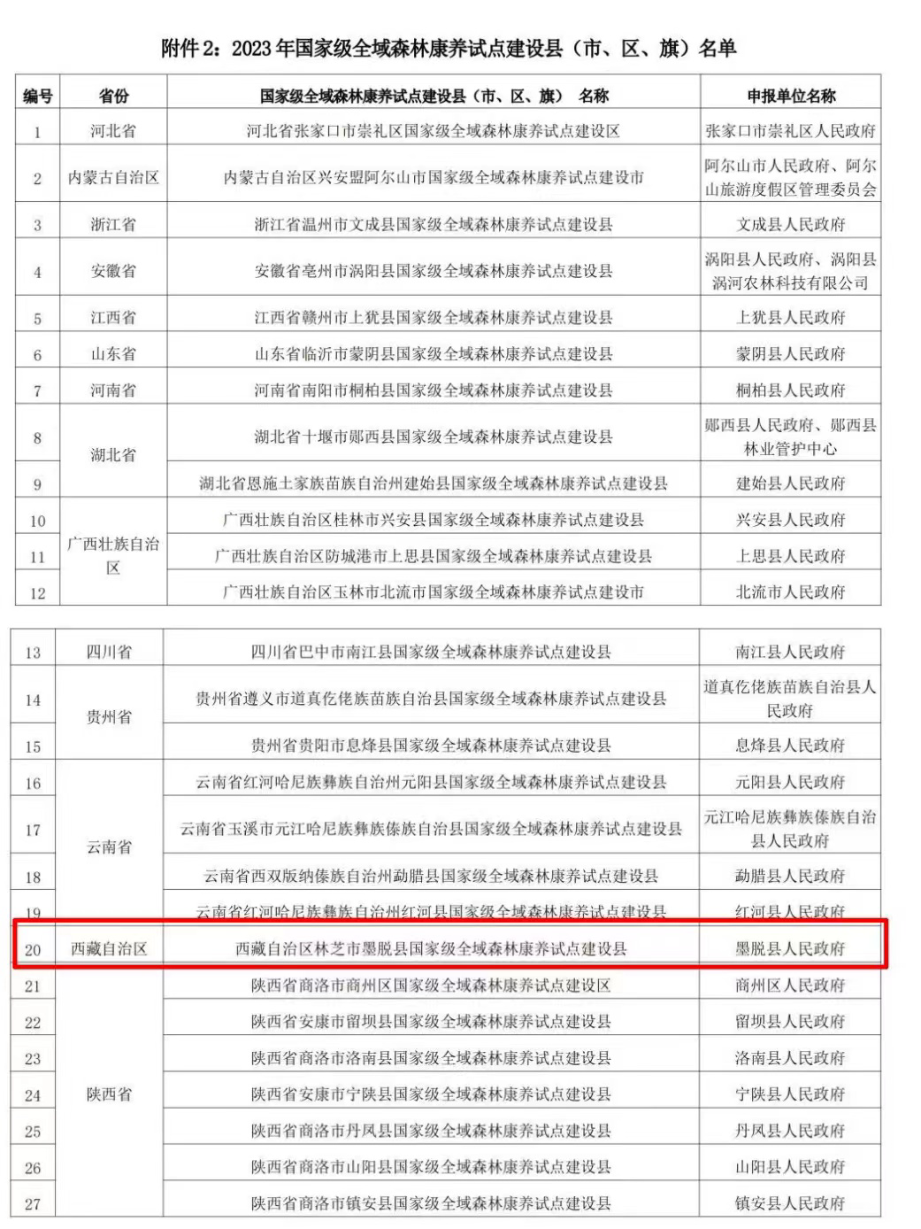 中國(guó)西藏網(wǎng)訊 11月22日,中國(guó)林業(yè)產(chǎn)業(yè)聯(lián)合會(huì)公示了2023年國(guó)家級(jí)森林康養(yǎng)試點(diǎn)建設(shè)單位名單,西藏自治區(qū)林芝市墨脫縣入選2023年國(guó)家級(jí)全域森林康養(yǎng)試點(diǎn)建設(shè)縣,系西藏自治區(qū)唯一入選的縣。