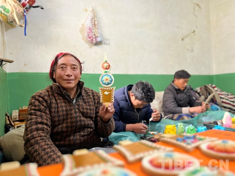 頓珠的二兒子丹增朗杰今年只有19歲,是一名高中生,但制作酥油花的手法已經極為嫻熟。他盤腿而坐,面前擺放著調制好的各色酥油和一盆清水。只見他捏取一小塊酥油在冷水中浸泡一會,然后熟練地用食指和拇指將酥油捏成不同形狀,粘貼于一塊盾形木板上,一對對色彩斑斕、寓意吉祥的酥油花作品便完成了。