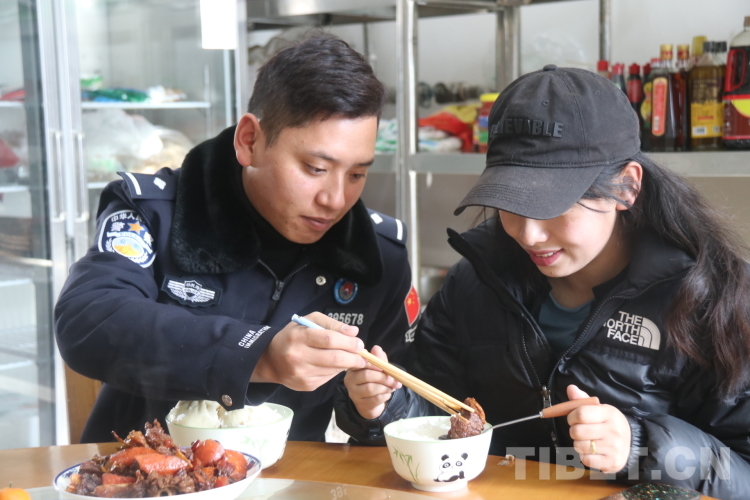 氧氣瓶、高原藥品、熱水......接德吉永措的車上已準(zhǔn)備好了各種抗高反和取暖的東西,這讓她提前感受到了來(lái)自丈夫單位的熱情與關(guān)懷。與愛(ài)人相聚后,旦增洛追帶著妻子參觀營(yíng)區(qū),迫切地想讓她了解他用青春為之奮斗的警營(yíng),隨后他又帶著妻子到單位食堂品嘗自己親自下廚做的紅燒肉?!班?!味道很好?!钡录来氤灾煞蚪o她夾的肉,臉上洋溢著幸福的笑容。