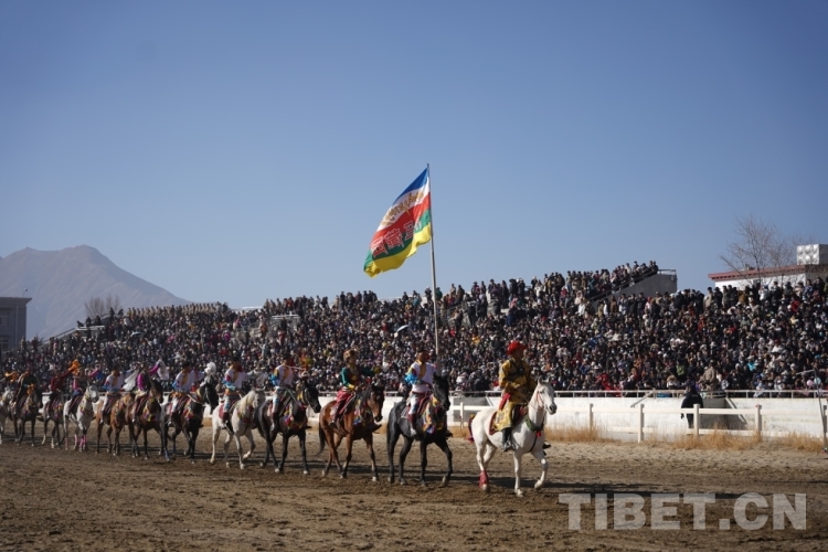 圖為西藏馬術(shù)隊(duì)入場(chǎng)給觀眾拜年 攝影:旦曲