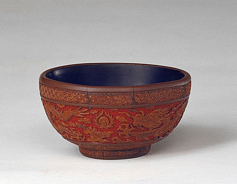 此剔黃云龍紋碗,高6.9厘米,口徑13厘米。碗圓口,內(nèi)髹黑漆,直壁下斂接圈足??谕庋丶案瓜虏拷闾庽埸S漆,雕“卍”字錦、如意云頭紋各一周。腹部以朱漆刻花錦為地,兩條黃色行龍追逐滾動的火珠,雙目圓瞪,活力四射,氣韻生動。碗足內(nèi)有刀刻填金“大明萬歷己丑年制”楷書款,該漆器的龍紋形象以及細(xì)謹(jǐn)?shù)募y飾為萬歷時期雕漆的典型風(fēng)格。(中國西藏網(wǎng) 綜合/周晶)