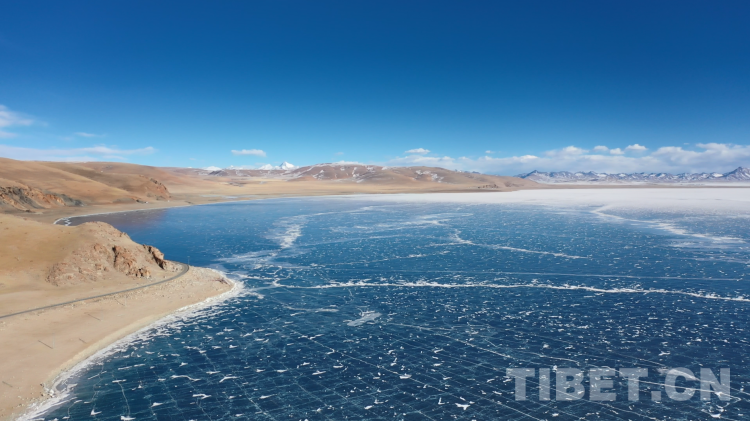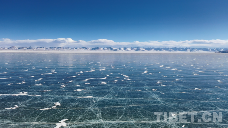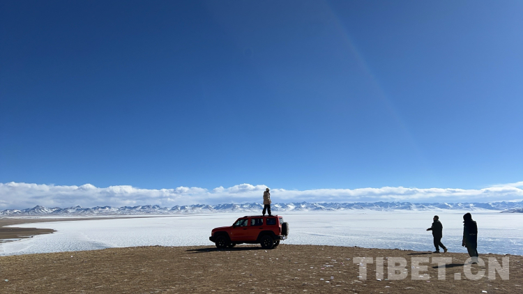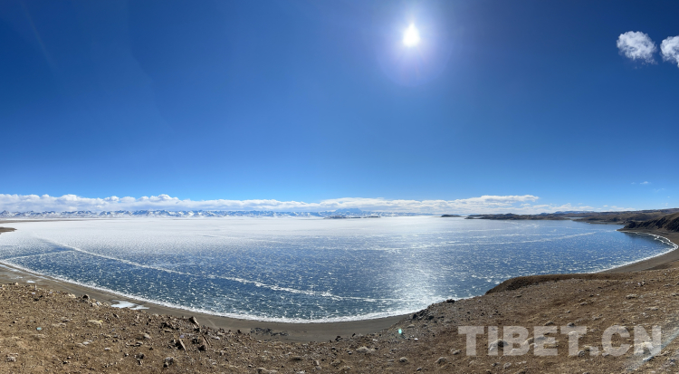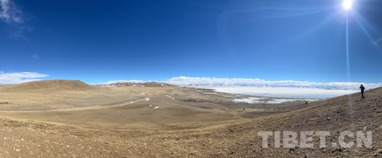 爬上一座山丘,視野陡然明亮開闊起來。原本土黃色的藏北天然牧場高低起伏,黑牦牛零星地散落在山坡,登上高處后,天際圣境納木錯便映入眼簾。初春時節(jié)的拉薩依然春寒料峭,納木錯的落雪還未完全消融,站在高處俯視,這片安靜的大湖被陽光反射得白茫茫一片。更幸運的是碰到了晴好的天氣,白云與湖冰相襯,亦與遠(yuǎn)山相接,視線盡頭的念青唐古拉山脈直視無礙,畫面猶如“半池白云半池玉”般頗具美感。