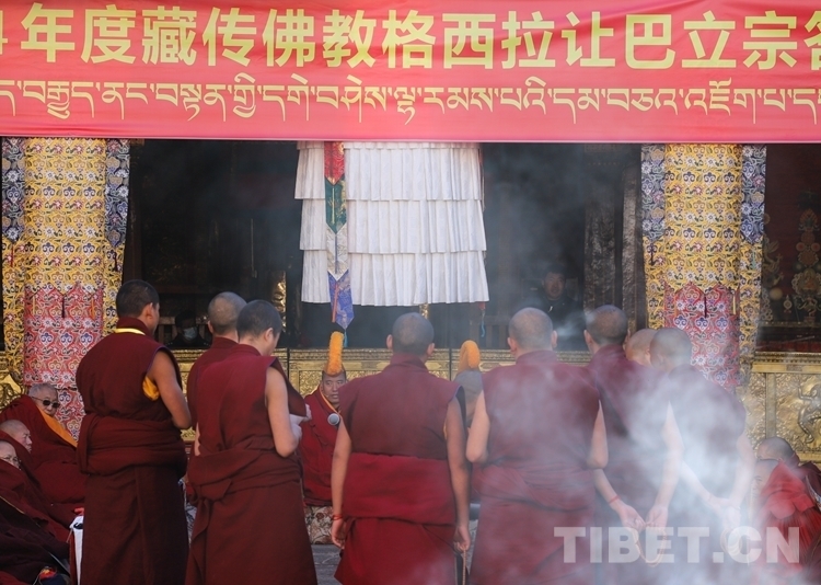 當日上午9時,立宗答辯儀式正式開始,儀式由藏傳佛教學經僧人考取格西拉讓巴學位考評委員會主持。按照傳統慣例,先舉行無齋佛事活動,在考評委員會的監(jiān)考下,應考格西拉讓巴學位的12名考僧輪流答辯陪考僧眾所提有關《釋量論》《般若學》《中觀學》《俱舍論》《戒學》五部經典方面的內容。立宗答辯儀式結束后,所有參加答辯儀式的僧人集體誦經祈禱,同時供齋茶齋飯。齋后,由西藏自治區(qū)宗教局負責人代表西藏自治區(qū)政府向參加答辯活動的僧人發(fā)放布施。