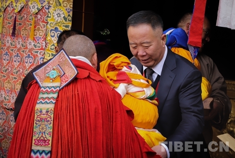 圖為西藏自治區(qū)政府副秘書長高寶軍向獲得學位的考僧贈送五彩緞、干果、袈裟 攝影:賈華加