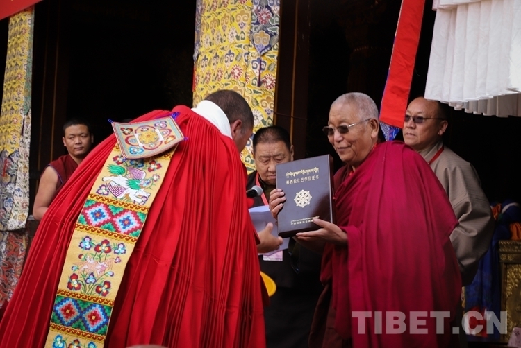 圖為佛協西藏分會副會長、扎什倫布寺堪布噶欽?多吉堅贊向獲得學位的考僧獻哈達并頒發(fā)學位證書 攝影:賈華加