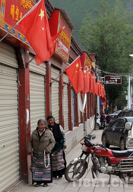 懸掛著五星紅旗的比如縣城街景(唐召明2014年7月9日攝)