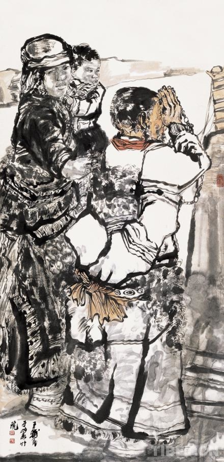 “真正深入當(dāng)?shù)厝ンw驗(yàn)藏族群眾的生活,創(chuàng)作出來的作品才會(huì)真實(shí)感人。”王輔民在談到藏族題材的創(chuàng)作感悟時(shí)說,“青藏高原最吸引人的地方是生活在這里的人們飽滿的精神狀態(tài)。我們要敬畏自然,尊重文化,保持充滿感情、充滿崇敬之情的創(chuàng)作情感和態(tài)度,用中國(guó)畫的水墨形式去表現(xiàn)藏族群眾的生活,去表現(xiàn)雪域的蒼茫與藏族群眾頑強(qiáng)不屈的性格,表現(xiàn)人與自然的關(guān)系。”
