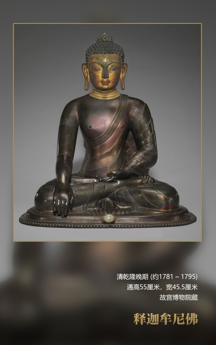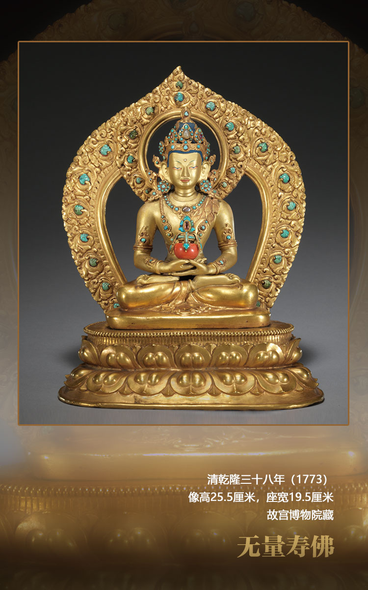 這尊造像與其他五十五尊同樣造型的無量壽佛,一同供奉在紫禁城養(yǎng)性殿西暖閣佛堂的一座八面七層的紫檀木佛塔中。根據(jù)《六世班禪洛桑巴丹益希傳》、內(nèi)務(wù)府造辦處《活計檔》及軍機(jī)處滿文檔案的記載,乾隆帝在乾隆三十五年(1770)寧壽宮區(qū)域營建開始前,即乾隆三十三年(1768)向六世班禪訂做了這五十六尊無量壽佛,佛像圖樣、鑲嵌寶石等材料均為宮廷提供。這些造像于乾隆三十八年完成并送回宮廷,此后一直供奉于養(yǎng)性殿佛堂至今。乾隆四十五年(1780)六世班禪進(jìn)京朝覲,還曾親自瞻仰過此塔此像。故這組無量壽佛,是乾隆時期宮廷審美與扎什倫布寺造像技術(shù)的高度融合,經(jīng)過乾隆帝本人親自設(shè)計,又有明確的制作時間,是清代宮廷造像及扎什倫布寺造像研究的重要標(biāo)型器物。