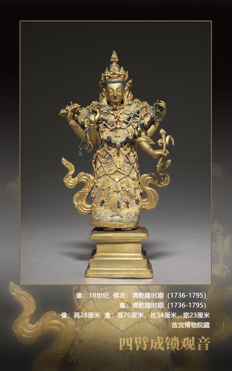 成鎖觀音,即不空羂索觀音。觀音一面四臂,分別持羂索、金剛杵、念珠、金剛鉤,在現(xiàn)在的圖像里很少找到持物相同的造像,可能是特別的傳承。觀音立姿站于方形臺座上。因其所著佛衣未曾打開,故造像身體裝飾情況不清。佛衣為清宮配做,繡工精細(xì),上綴串珠瓔珞,極具宮廷風(fēng)格。另有清宮配做紫檀木重檐亭式玻璃門佛龕,龕背面陰刻四體文題記,漢文為:“乾隆三十七年十二月十二日,欽命阿旺班珠爾胡土克圖認(rèn)看供奉大利益扎什璃瑪四背成鎖觀世音菩薩?!薄八谋场奔础八谋邸钡恼`書。