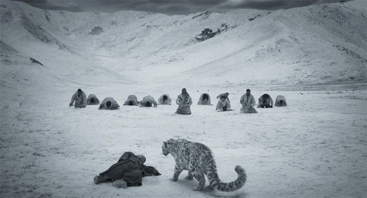 影片的結(jié)尾似乎很突然,雪豹終究沒(méi)有死在受損牧人暴怒的情緒和揮舞的錘子下,在人類(lèi)文明的關(guān)照下,被主動(dòng)解圍,回歸雪山,與小雪豹相會(huì)相伴。只有萬(wàn)導(dǎo)這種深邃包容、沉著冷靜又充滿(mǎn)睿智的作家、藝術(shù)家才能挖掘和表現(xiàn),這里蘊(yùn)含著生命的慈悲和世人的智慧。對(duì)此,我們還有哪些拷問(wèn)呢?