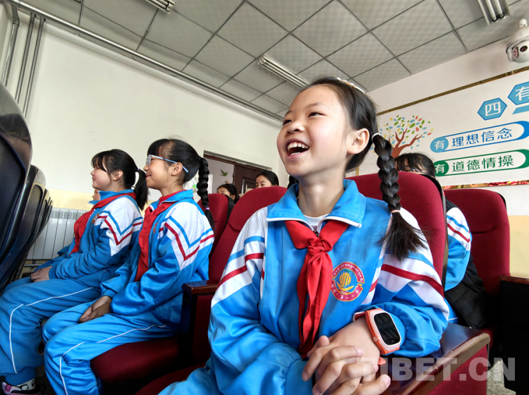 圖為4月23日,西藏自治區(qū)新華書店在拉薩市城關(guān)區(qū)海淀小學(xué)開(kāi)展的“享受閱讀 讓夢(mèng)飛翔”閱讀校園行活動(dòng)互動(dòng)環(huán)節(jié),有趣的互動(dòng)把小學(xué)生給逗樂(lè)了 攝影:次旦拉姆