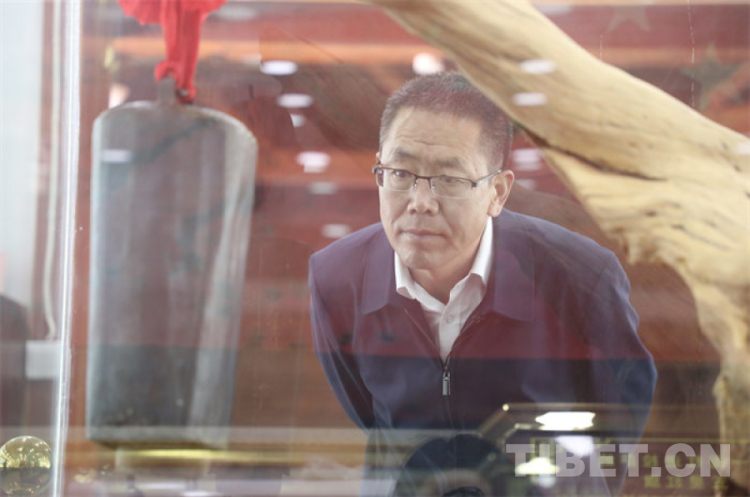 圖為莫河駝場青藏駝隊歷史陳列館館長張存虎觀看西藏運輸總隊頭駱駝鈴 攝影:王茜