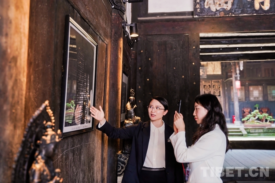 姜氏古茶第十五代傳承人萬(wàn)姜紅(左)在中國(guó)西藏網(wǎng)視頻號(hào)直播時(shí)向廣大網(wǎng)友介紹姜家大院歷史和有關(guān)老照片的故事 楊洋供圖