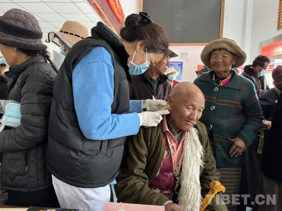 圖為洛隆縣藏醫(yī)院及人民醫(yī)院的醫(yī)療團(tuán)隊(duì)在現(xiàn)場(chǎng)開展平衡火罐、艾灸等中醫(yī)診療服務(wù) 供圖:洛隆縣藏醫(yī)院