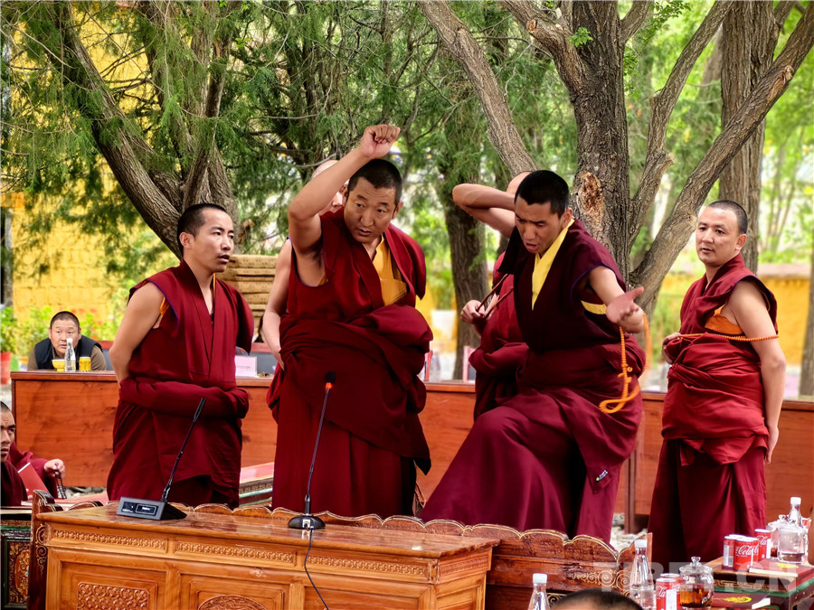 午后的陽光慵懶地灑在辯經(jīng)場,卻擋不住辯經(jīng)的智者們爭先恐后、高舉手臂提問,手臂向下?lián)]落,象征著智慧之劍砍向無知。熱烈的氣氛中,智者們拍手擊掌、獨(dú)立頓足、舞動(dòng)佛珠、慷慨陳詞、大聲質(zhì)問,仿佛如此便得到了無窮的智慧?;顒?dòng)現(xiàn)場氣氛十分熱烈、精彩紛呈,交流內(nèi)容充實(shí)飽滿、將所學(xué)與實(shí)際相結(jié)合,充分展現(xiàn)了日常所學(xué)所思所得,閃光思維的碰撞迸發(fā)了智慧的火花,贏得了現(xiàn)場觀眾拍手叫絕,陣陣掌聲。