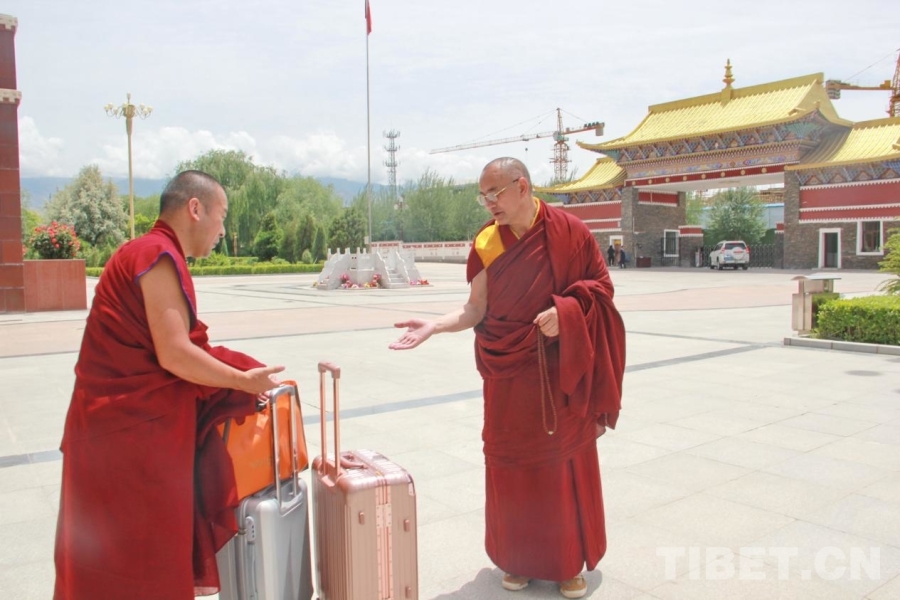 圖為青海省藏語系佛學院教務處副處長、特級經師悟嘉倉(左一)與準備離校的畢業(yè)學僧交談 攝影:劉莉
