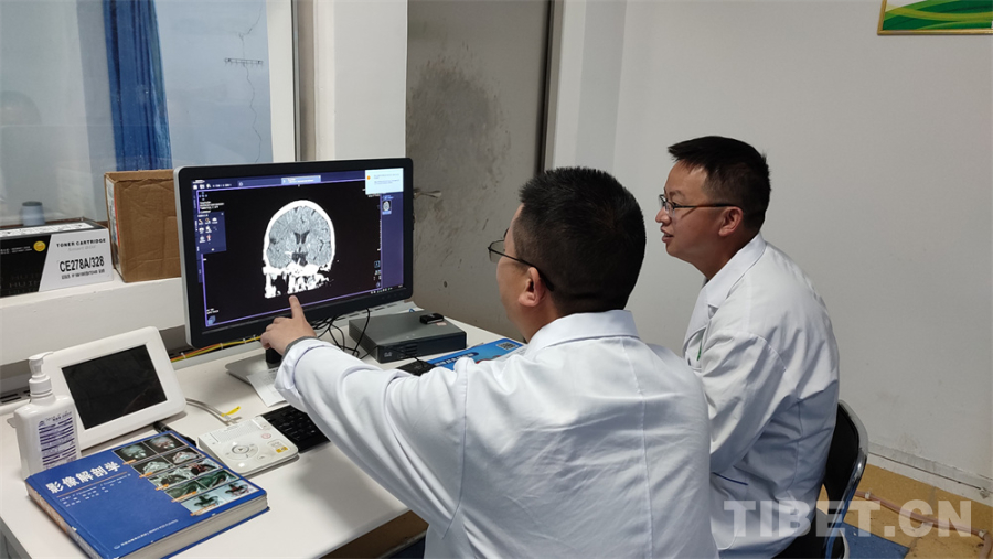 圖為醫(yī)療隊(duì)隊(duì)員對(duì)腦?;颊叩娘B腦CT進(jìn)行閱片
