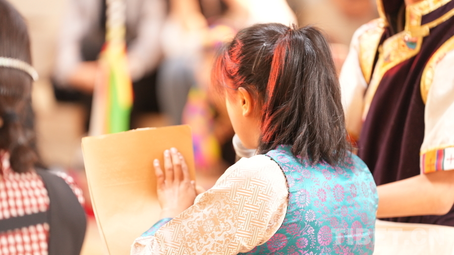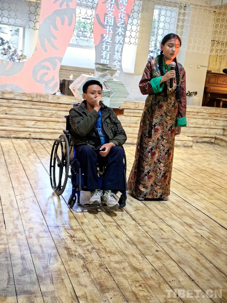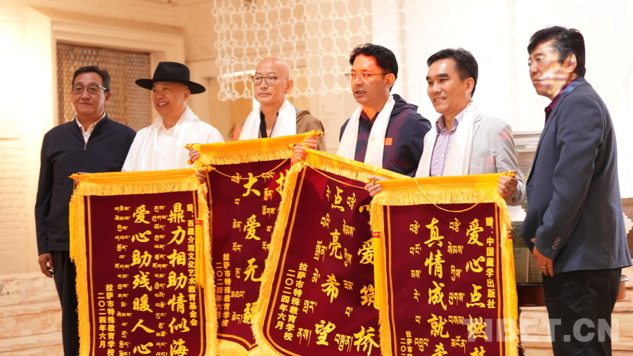 活動(dòng)現(xiàn)場(chǎng),拉薩市特殊教育學(xué)校師生向西藏社會(huì)主義學(xué)院羅旦博士、中國(guó)藏學(xué)出版社代表、北京大方弘文圖書發(fā)行有限公司代表、西藏介觀文化藝術(shù)教育基金會(huì)代表敬獻(xiàn)了哈達(dá),贈(zèng)送了錦旗、畫作,對(duì)他們?cè)谛聲霭嬷薪o予的支持和幫助表達(dá)了誠(chéng)摯的謝意。隨后,拉薩市特殊教育學(xué)校學(xué)生為現(xiàn)場(chǎng)來賓表演了二重唱《愛在陽光下》、詩歌朗誦《光明》、舞蹈《舞動(dòng)大地》等精彩的節(jié)目,將活動(dòng)推向高潮,現(xiàn)場(chǎng)觀眾紛紛鼓掌叫好,氣氛十分感人。