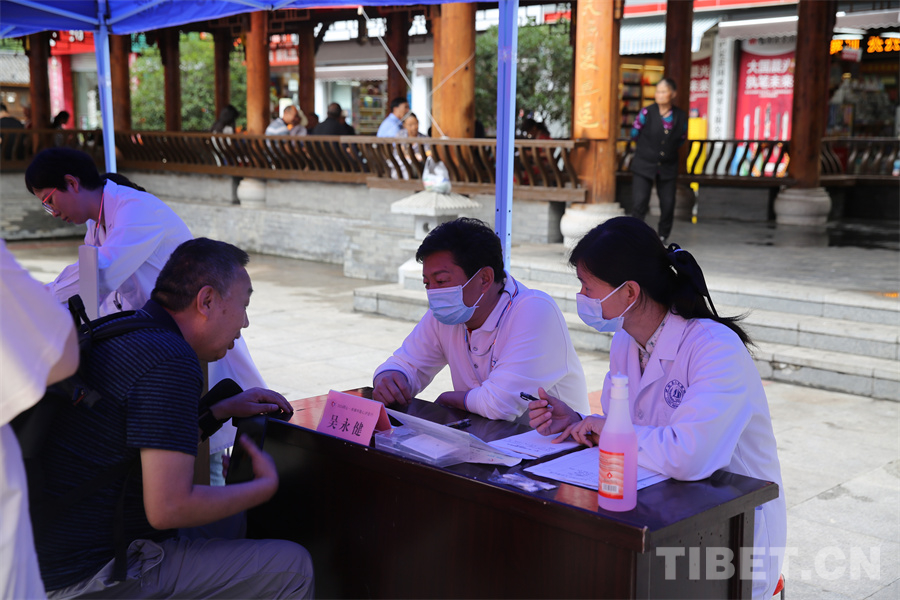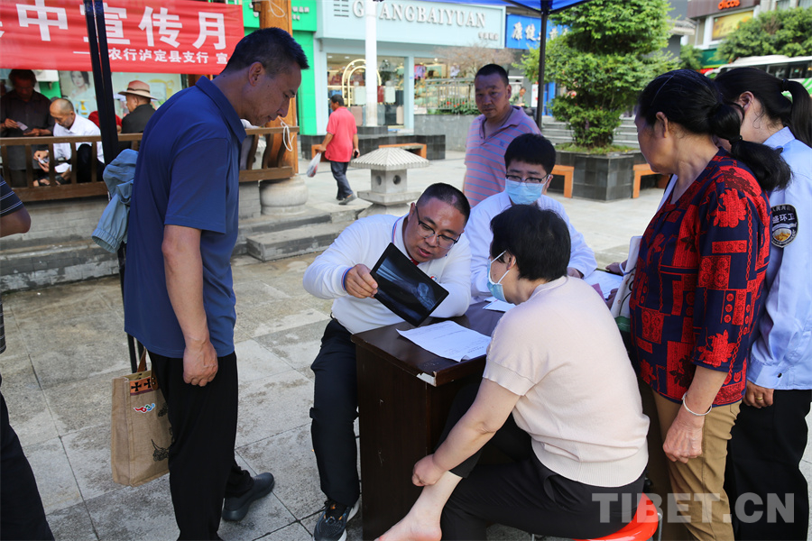 圖為瀘定橋廣場(chǎng)義診點(diǎn),骨科專(zhuān)家正在為患者診治 攝影:登真巴珍