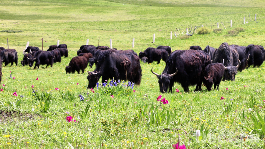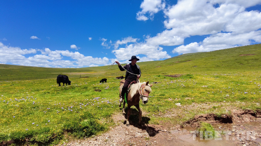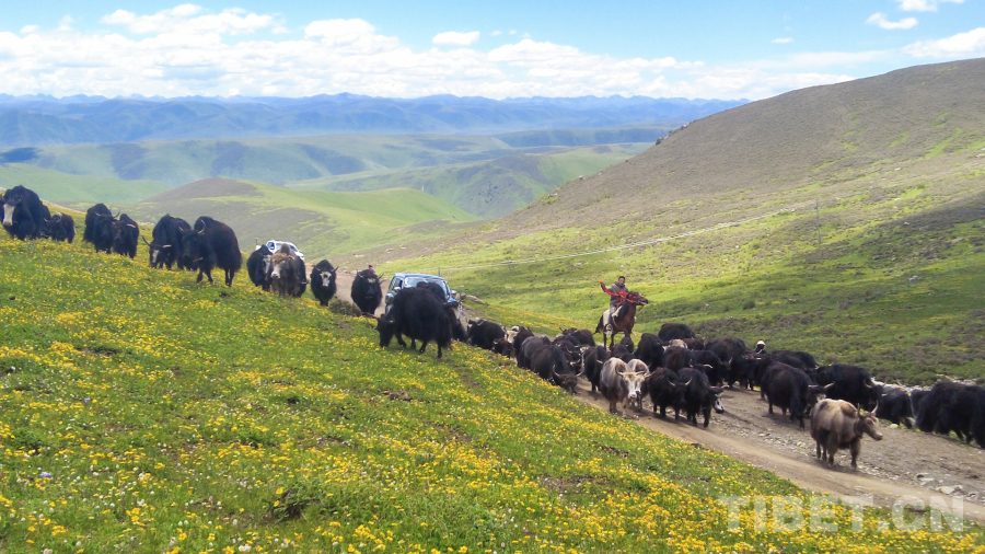 早晨天剛蒙蒙亮,他們就準(zhǔn)備出發(fā)了,一家人把生活必需品黑帳篷,火爐,鍋碗瓢盆,被褥及酥油糌粑等物資打包裝車,由家人先駕駛拖拉機(jī)把所有物資運(yùn)送到夏季遠(yuǎn)牧點(diǎn),四郎彭措則和他的侄兒騎馬趕牛出發(fā)。冬季牧場到夏季牧場距離60公里,他們經(jīng)過9個(gè)小時(shí)的遷徙,終于在下午3點(diǎn)到達(dá)夏季牧場。此時(shí)他的家人也在鄰居的幫助下搭好了帳篷,煮好了酥油茶等待著他們。到了夏季牧場,牦牛們也迫不及待奔向了肥美的水草,四郎彭措和他的侄兒也終于可以卸下滿身的疲憊,品嘗家人們準(zhǔn)備好的美食。夏季牧場正是一年當(dāng)中最美的季節(jié),草原上開滿了五顏六色的花朵,多日不見的好友也帶著自己的家人早一步駐扎在此地,四郎彭措說道:“夏季放牧,轉(zhuǎn)場雖然辛苦,但也是一年中難得的閑暇時(shí)光。夏季水草肥美,牦牛們有充足的食物,來到夏季牧場放牧的牧民也有更多的活動時(shí)間,賽馬、唱歌、跳鍋莊舞是我最喜歡的活動。”