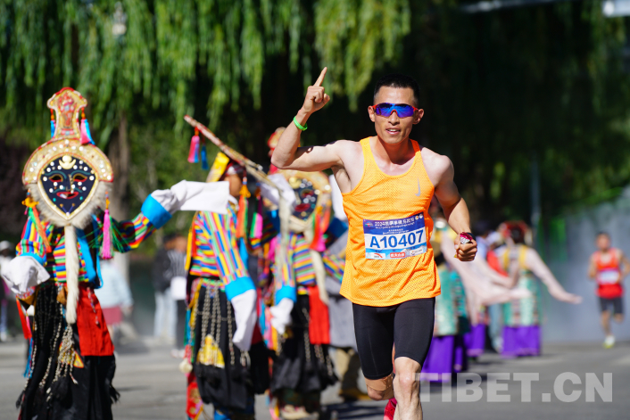 圖為 2024拉薩半程馬拉松18公里處參賽選手途經拉魯濕地國家級自然保護區(qū),拉薩市城關區(qū)藏戲藝術團以藏戲的形式為選手加油助威 攝影:趙振宇