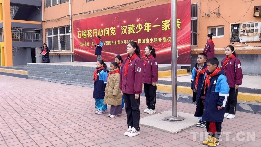 圖為日土縣和灤南縣青少年同升一面國旗